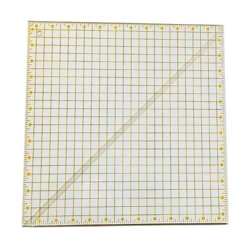 This precision 12.5 x 12.5 inch quilting ruler is an essential tool for creating perfect half square triangles in your quilting projects. The clear acrylic ruler features easy-to-read grid lines in a contrasting yellow color that makes measuring and cutting a breeze. With measurements clearly marked along all sides and convenient 1-inch grid squares, this ruler helps maintain accuracy in your patchwork pieces. The ruler includes a small hole for convenient hanging storage.