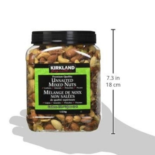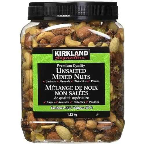 Kirkland Signature Extra Fancy Unsalted Mixed Nuts are delicious and nutritious. They’re 2.5 lbs. of great tasting Cashews, Almonds, Pistachios, and Pecans which also makes them a natural source of protein, fiber and essential nutrients – without the salt!
