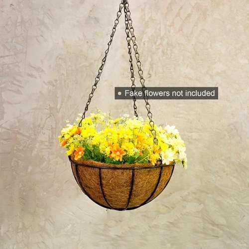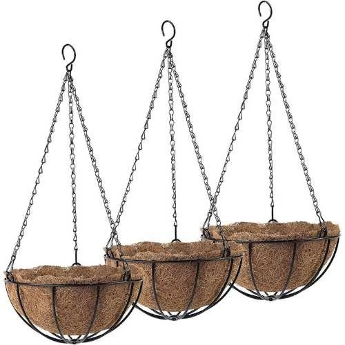 Pack of 3 round hanging planters with coco fiber liners. Rustic Indoor and outdoor decoration.Unit Size: 10″ dia. x 4-3/4″ deep. Total length includes the chain is about 21-1/2″.Strong and durable metal construction with plastic coating prevent from rusting for long time outdoor use.Coco fiber liner provides superior drainage. Recommend to plant living plants with non-woven fabric liner(NOT included) to reduce water leakage and prevent soil from falling.